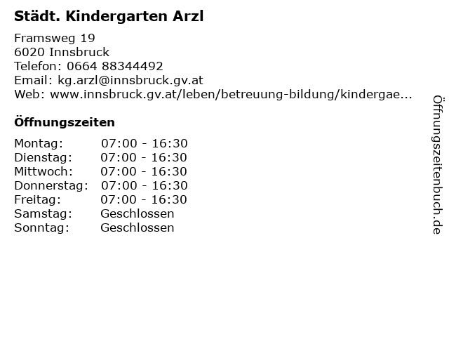 | Öffnungszeiten Städt. Kindergarten Arzl in Innsbruck anzeigen | |