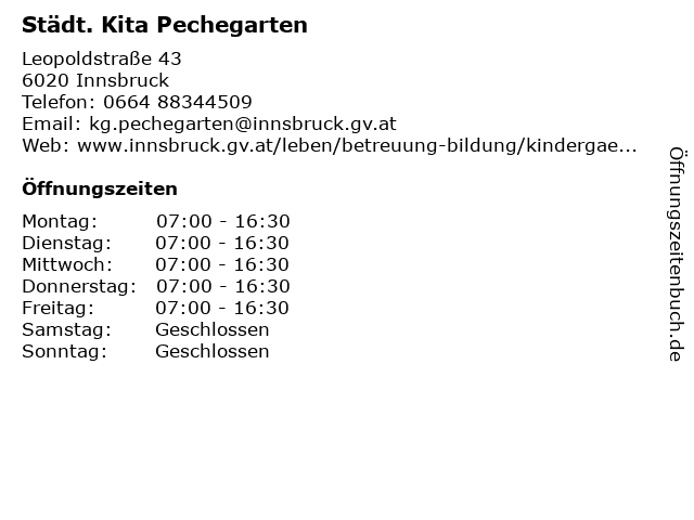 | Öffnungszeiten Städt. Kita Pechegarten in Innsbruck anzeigen | |