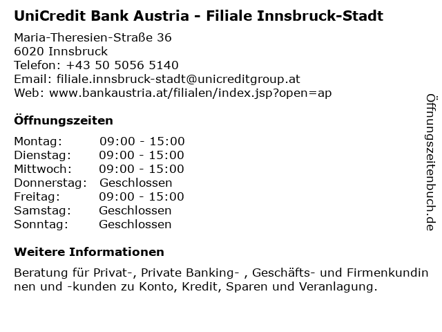 Branchen & Suchbegriffe zu UniCredit Bank Austria - Filiale Innsbruck-Stadt:austria, bank, geschäfts- und firmenkundinnen und -kunden, innsbruck, privat-, private banking-, stadt, unicredit |