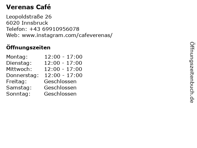 | Öffnungszeiten Verenas Café in Innsbruck anzeigen | |