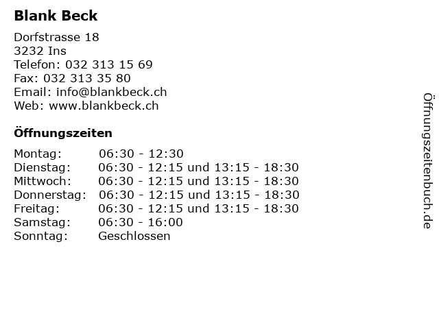 | Öffnungszeiten Blank Beck in Ins anzeigen | |