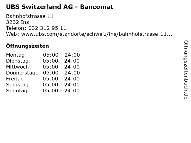 | Öffnungszeiten UBS Switzerland AG - Bancomat in Ins anzeigen | |