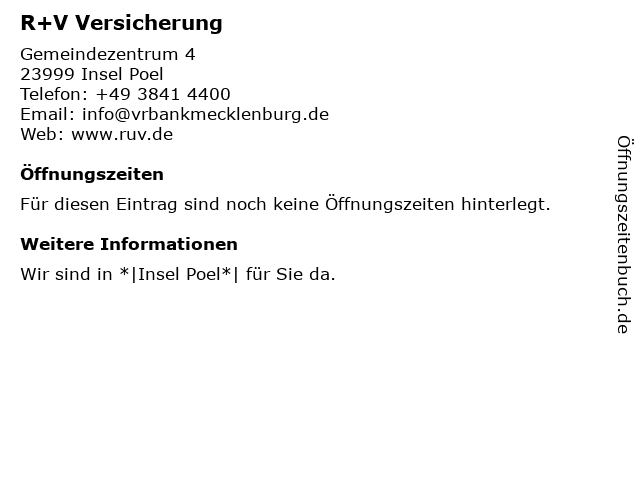 | Öffnungszeiten R+V Versicherung in Insel Poel anzeigen | |