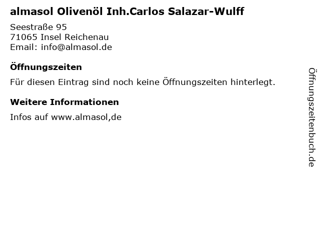| Öffnungszeiten almasol Olivenöl Inh.Carlos Salazar-Wulff in Insel Reichenau anzeigen | |