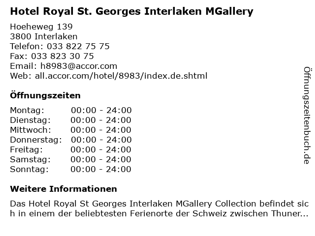 3 Hotel Royal St Georges Interlaken | Restaurant The Verandah (Entfernung: 0,01 km) Hoeheweg 139, 3800 Interlaken 4 Hotel Royal St Georges Interlaken | Bar-Lounge Royal (Entfernung: 0,01 km) Hoeheweg 139, 3800 Interlaken 6 |