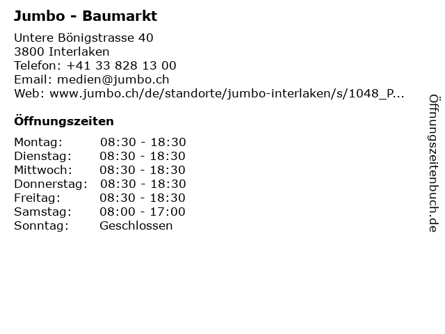 | Öffnungszeiten Jumbo - Baumarkt in Interlaken anzeigen | |