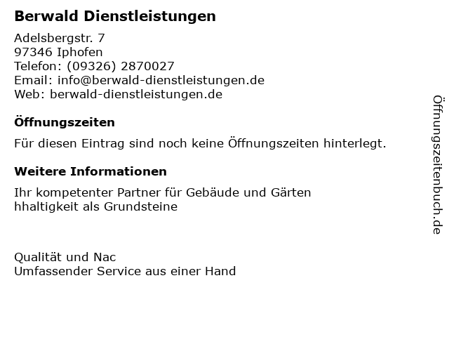 | Öffnungszeiten Berwald Dienstleistungen in Iphofen anzeigen | |
