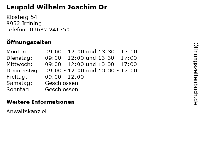 | Öffnungszeiten Leupold Wilhelm Joachim Dr in Irdning anzeigen | |