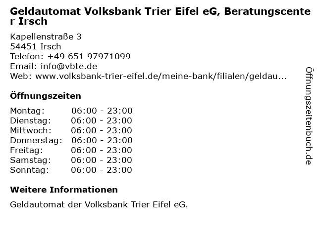 Branchen & Suchbegriffe zu Geldautomat Volksbank Trier Eifel eG, Beratungscenter Irsch:bargeld abheben, bargeld einzahlen, beratungscenter, eg, eifel, geldautomat, irsch, volksbank |