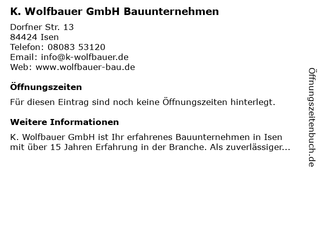 | Öffnungszeiten K. Wolfbauer GmbH Bauunternehmen in Isen anzeigen | |
