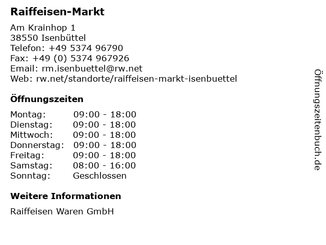 | Öffnungszeiten Raiffeisen-Markt in Isenbüttel anzeigen | |