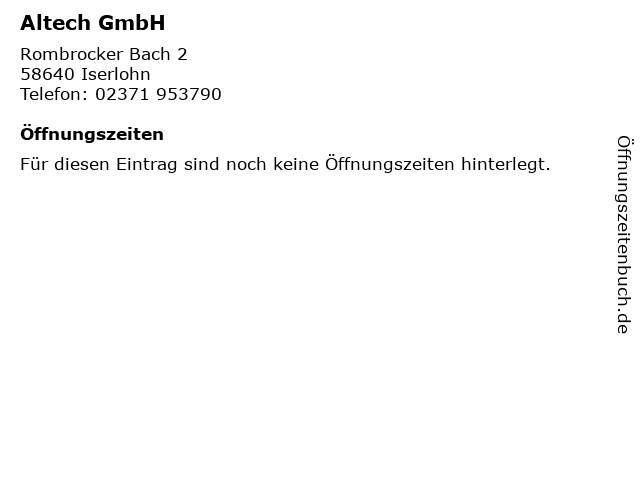 | Öffnungszeiten Altech GmbH in Iserlohn anzeigen | |
