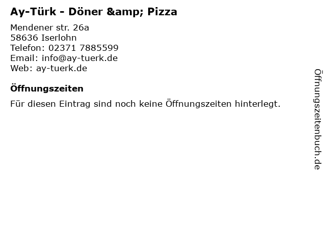 | Öffnungszeiten Ay-Türk - Döner & Pizza in Iserlohn anzeigen | |