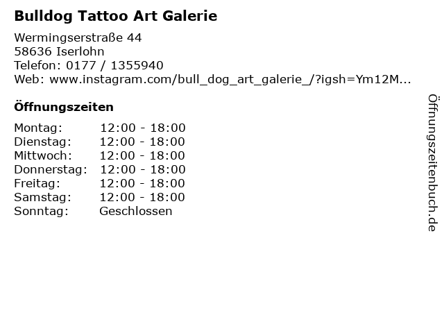 | Öffnungszeiten Bulldog Tattoo Art Galerie in Iserlohn anzeigen | |