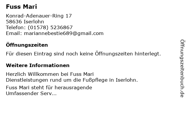 | Öffnungszeiten Fuss Mari in Iserlohn anzeigen | |