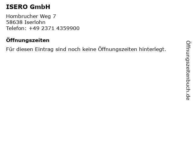 | Öffnungszeiten ISERO GmbH in Iserlohn anzeigen | |
