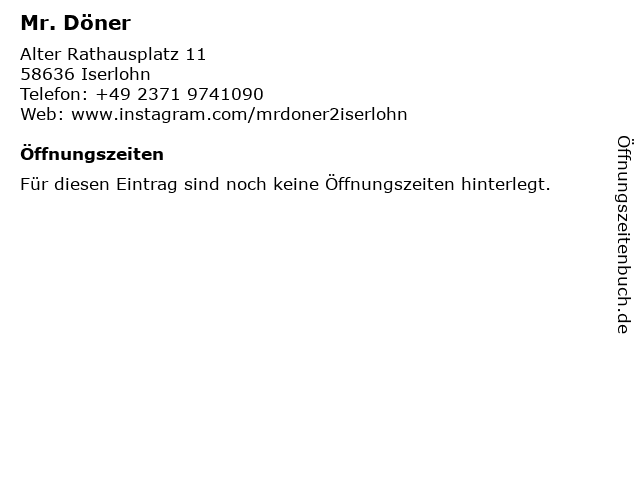 | Öffnungszeiten Mr. Döner in Iserlohn anzeigen | |