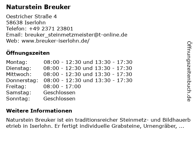 | Öffnungszeiten Naturstein Breuker in Iserlohn anzeigen | |