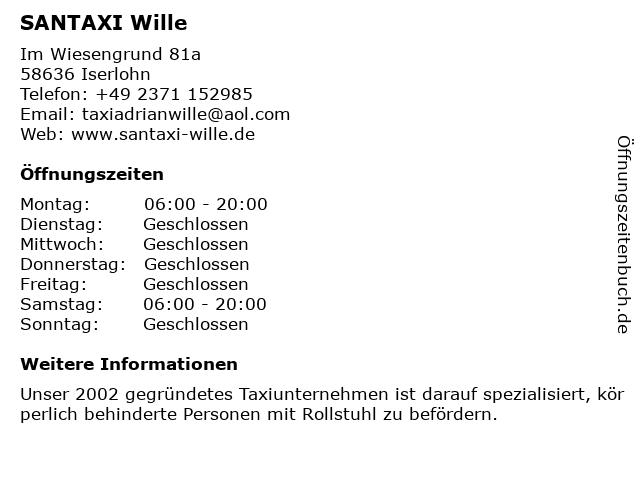 | Öffnungszeiten SANTAXI Wille in Iserlohn anzeigen | |