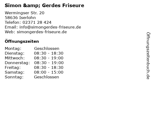 | Öffnungszeiten Simon & Gerdes Friseure in Iserlohn anzeigen | |