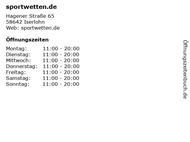 | Öffnungszeiten sportwetten.de in Iserlohn anzeigen | |