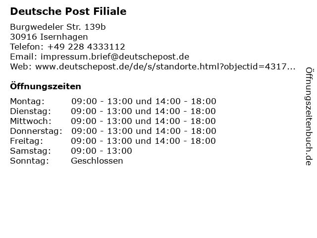 Öffnungszeiten Deutsche Post Filiale in Isernhagen anzeigen | |