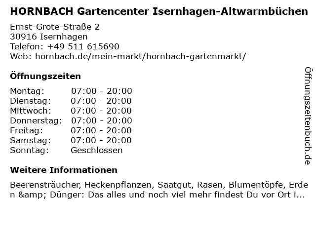 Branchen & Suchbegriffe zu HORNBACH Gartencenter Isernhagen-Altwarmbüchen:altwarmbüchen, gartenausstellung, gartencenter, gartenfachmarkt, gartenmarkt, gärtnerei, hornbach, isernhagen |