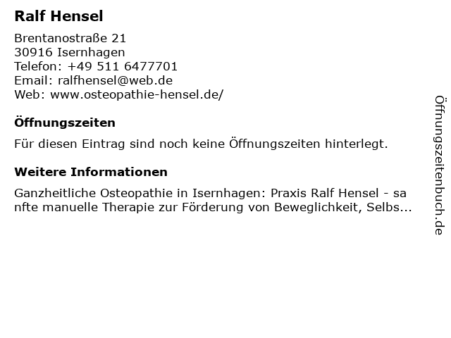 | Öffnungszeiten Ralf Hensel in Isernhagen anzeigen | |