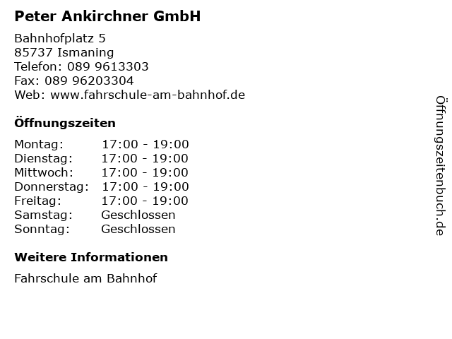 | Öffnungszeiten Peter Ankirchner GmbH in Ismaning anzeigen | |