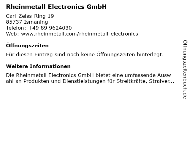 Branchen & Suchbegriffe zu Rheinmetall Electronics GmbH:ausbildungs- und trainingslösungen, cybersysteme, electronics, entwicklungsanwendungen, feuerleitsysteme, führungssysteme, innovation, lernanwendungen, missionsausstattungen, rheinmetall, sicherheitslösungen, soldatensysteme, trainingsanwendungen, waffenplattformen |