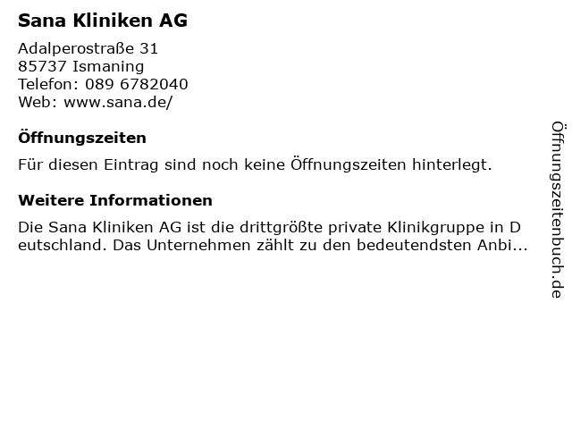 | Öffnungszeiten Sana Kliniken AG in Ismaning anzeigen | |