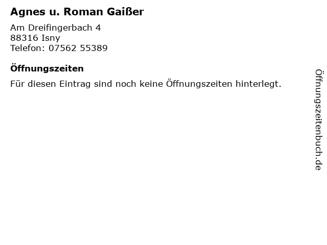 | Öffnungszeiten Agnes u. Roman Gaißer in Isny anzeigen | |