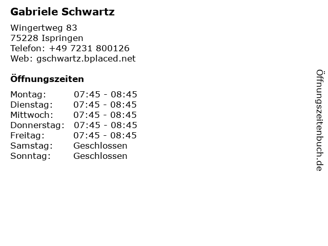 | Öffnungszeiten Gabriele Schwartz in Ispringen anzeigen | |