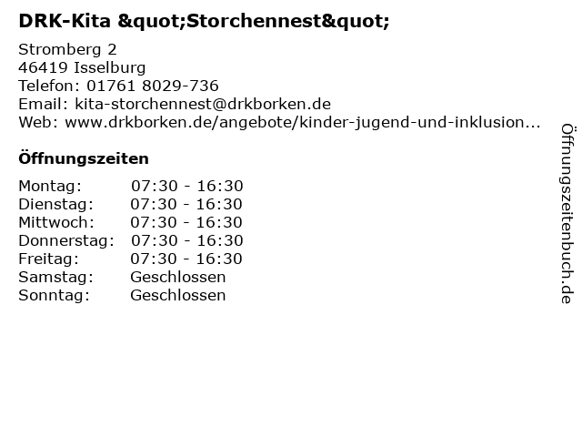 | Öffnungszeiten DRK-Kita "Storchennest" in Isselburg anzeigen | |