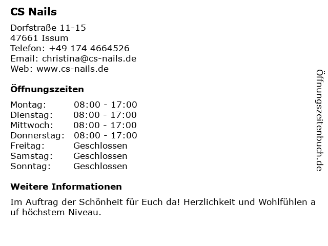 | Öffnungszeiten CS Nails in Issum anzeigen | |