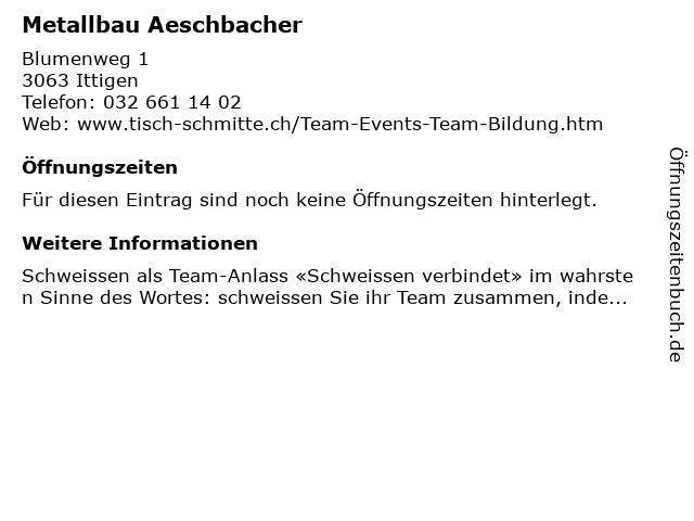 | Öffnungszeiten Metallbau Aeschbacher in Ittigen anzeigen | |