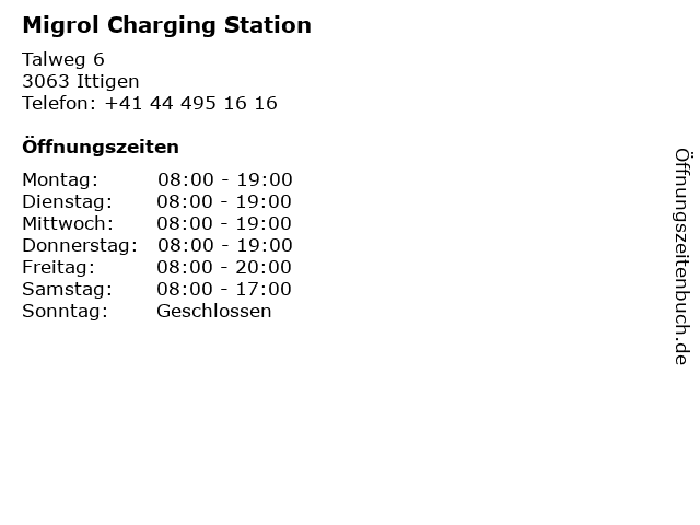| Öffnungszeiten Migrol Charging Station in Ittigen anzeigen | |