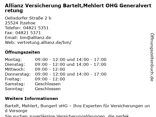 2 Allianz Versicherung Jan Koepke e.K. Generalvertretung (Entfernung: 1,69 km) Lindenstraße 62, 25524 Itzehoe 3 Allianz Versicherung Karsten Meyer Generalvertretung (Entfernung: 7,30 km) Kieler Straße 61, 25551 Hohenlockstedt 5 Andreas Walkenhorst Generalvertretung Allianz Versicherung (Entfernung: 13,76 km) Am Markt 9, 25358 Horst 6 Allianz Versicherung Michael Schmidt Generalvertretung (Entfernung: 14,04 km) Holstenstraße 23, 25560 Schenefeld |