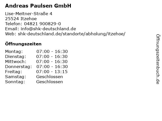 | Öffnungszeiten Andreas Paulsen GmbH in Itzehoe anzeigen | |