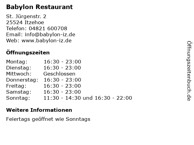 | Öffnungszeiten Babylon Restaurant in Itzehoe anzeigen | |