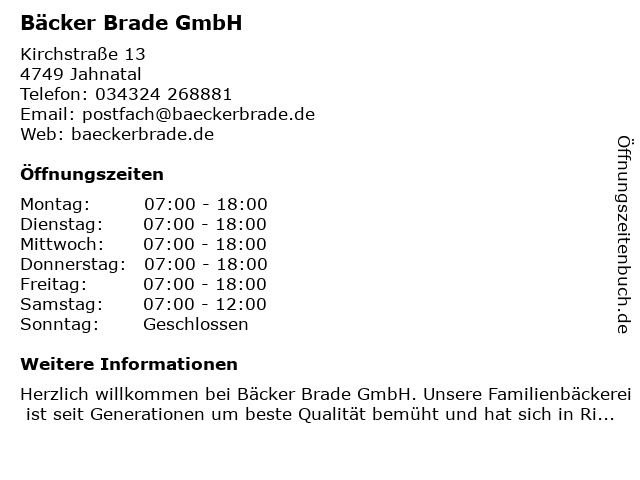 | Öffnungszeiten Bäcker Brade GmbH in Jahnatal anzeigen | |