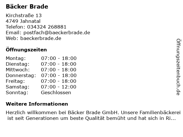 | Öffnungszeiten Bäcker Brade in Jahnatal anzeigen | |