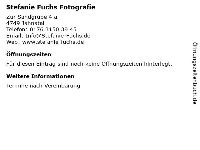 | Öffnungszeiten Stefanie Fuchs Fotografie in Jahnatal anzeigen | |