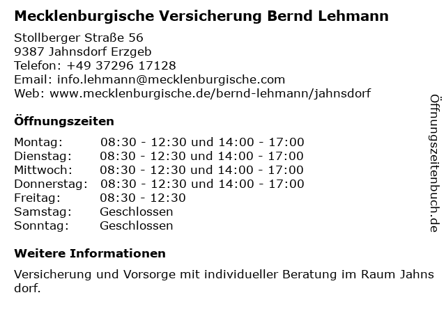 1 Allianz Versicherung Bernd Lehmann Generalvertretung (Entfernung: 0,01 km) Stollberger Straße 56, 09387 Jahnsdorf/Erzgebirge 3 Ingenieurbüro Lehmann + Partner, Büro Burkhardtsdorf (Entfernung: 5,82 km) Rathausplatz 7, 09235 Burkhardtsdorf 6 |