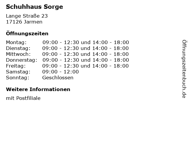 | Öffnungszeiten Schuhhaus Sorge in Jarmen anzeigen | |