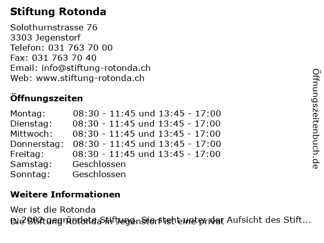 | Öffnungszeiten Stiftung Rotonda in Jegenstorf anzeigen | |