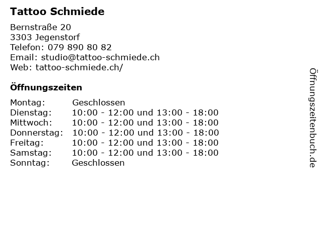 | Öffnungszeiten Tattoo Schmiede in Jegenstorf anzeigen | |
