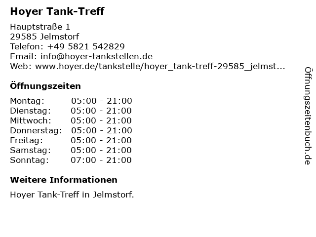 | Öffnungszeiten Hoyer Tank-Treff in Jelmstorf anzeigen | |