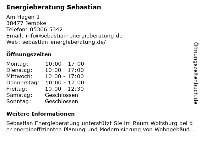 | Öffnungszeiten Energieberatung Sebastian in Jembke anzeigen | |