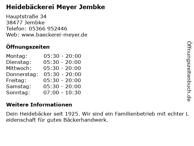 | Öffnungszeiten Heidebäckerei Meyer Jembke in Jembke anzeigen | |